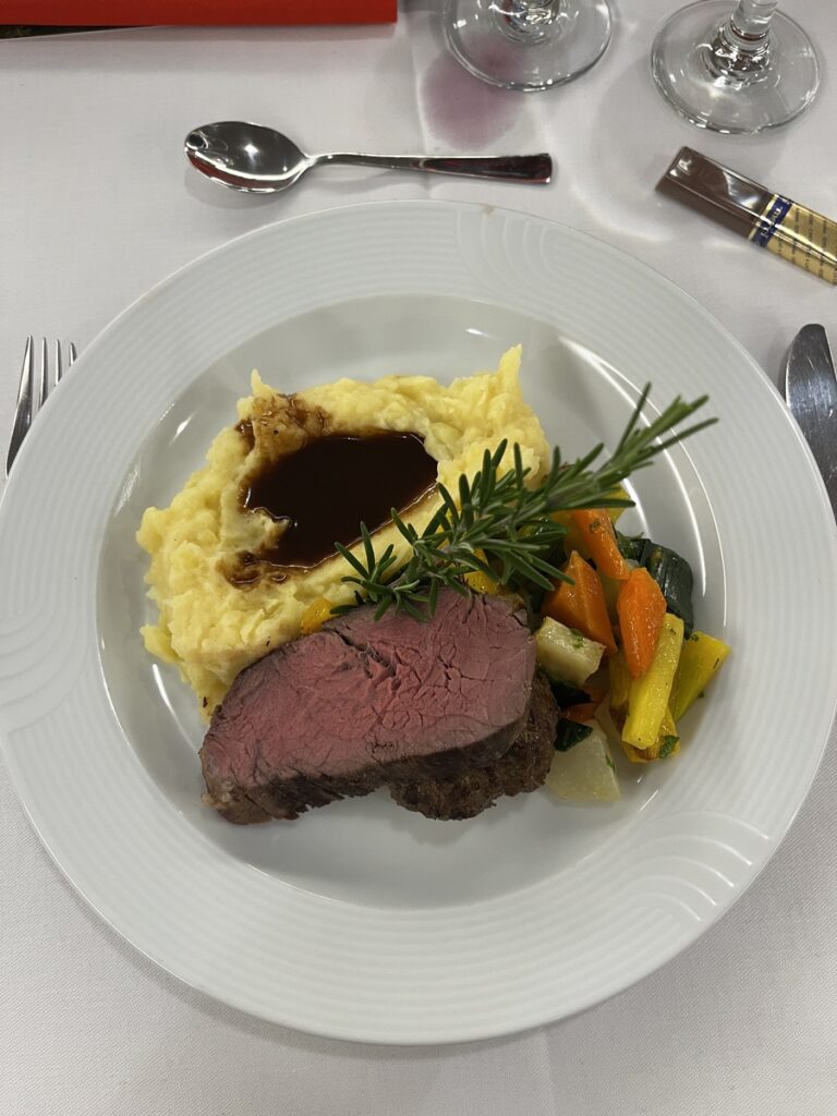 Nach dem Begrüssungsapéro wurde kulinarisch einiges geboten: Den Auftakt machte eine feine Kürbissuppe mit einem würzigen Käsezwirbel. Als Hauptgang folgte ein herbstliches Duett vom Steinweidrind – saftige Hacktätschli und rosa gebratene Huft, serviert mit Kartoffelstampf, buntem Herbstgemüse und feinem Jus. Abgerundet wurde das Menü mit einem Zwetschgen-Tiramisu im Glas.